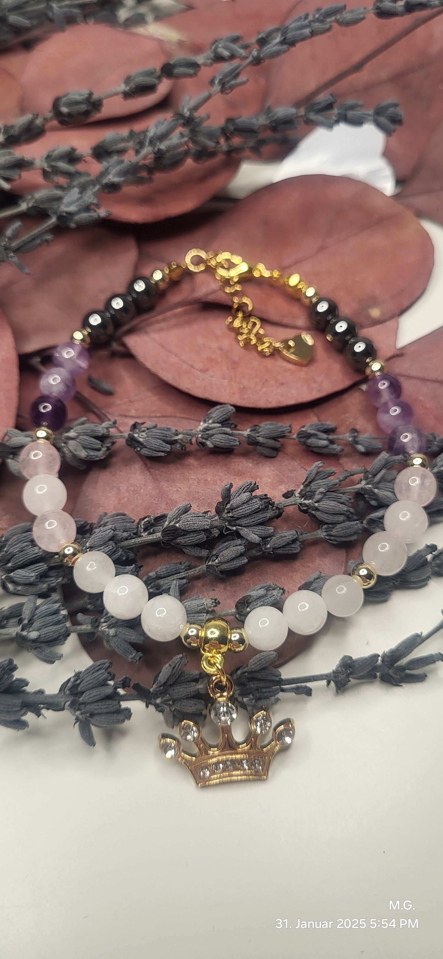 Das Göttinnen-Armband erinnert dich täglich an deine innere Kraft, Selbstbestimmung und Würde. Gefertigt aus Mondstein, Amethyst, Hämatit und Rosenquarz, begleitet dich dieses Schmuckstück auf deinem Weg zu Selbstvertrauen und innerer Balance.