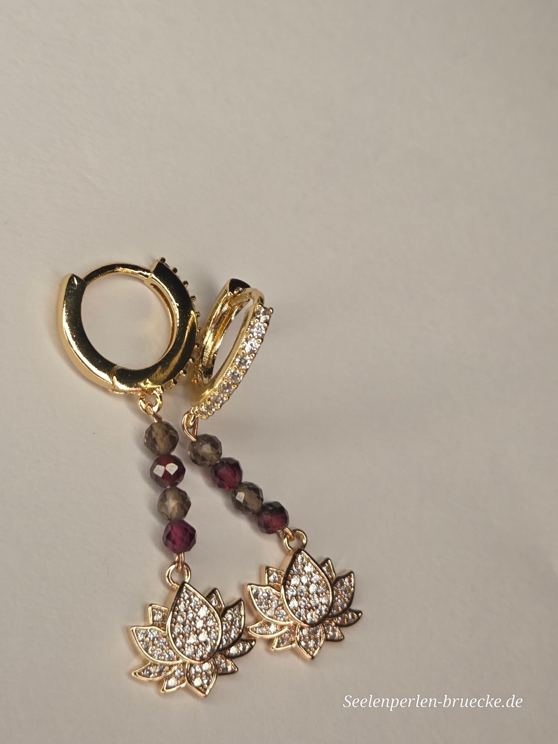 Diese handgefertigten Creolen vereinen kraftvolle Edelsteine mit der Symbolik des Lotus – ein Zeichen für Neubeginn, innere Stärke und weibliche Sinnlichkeit.